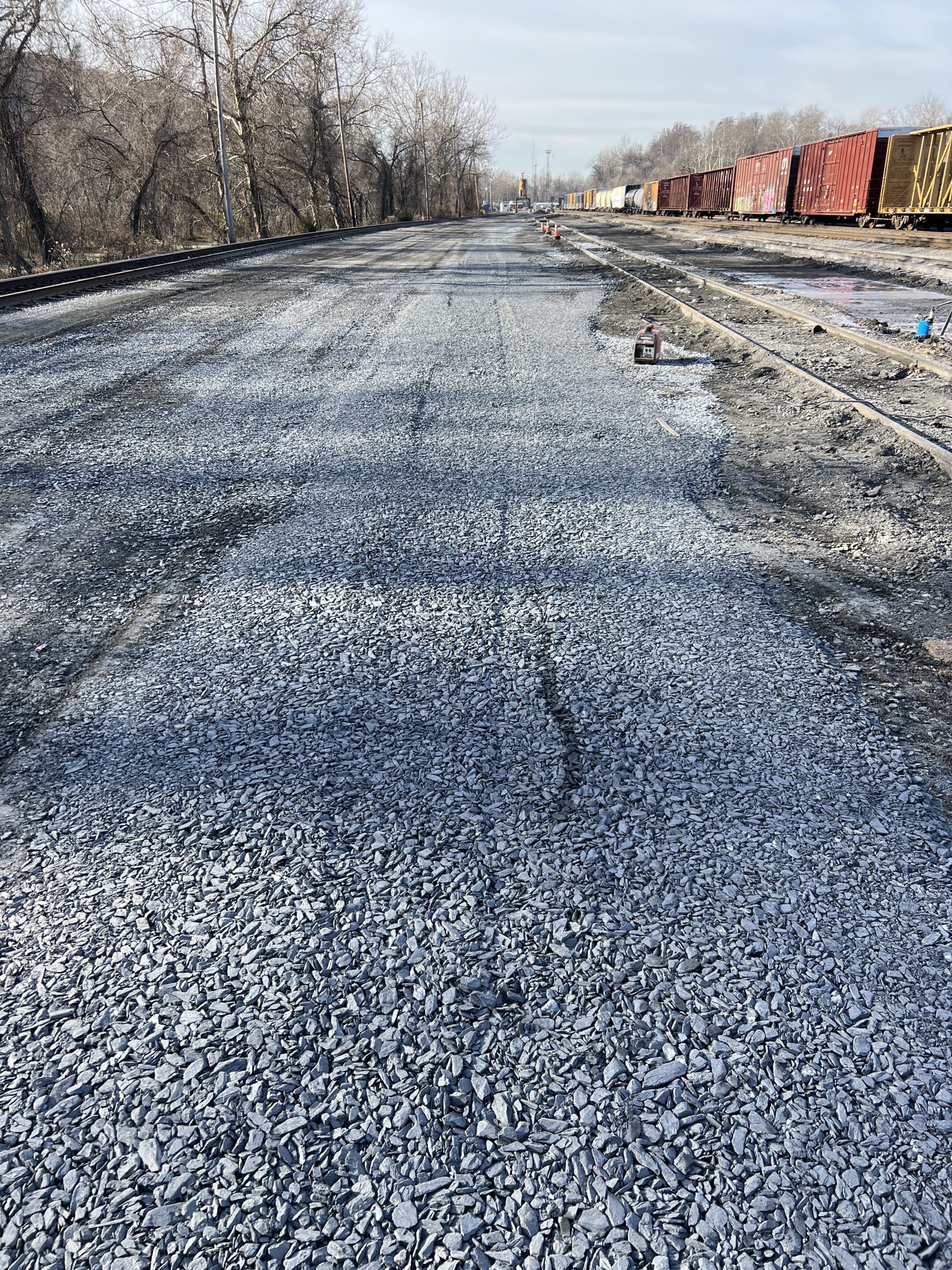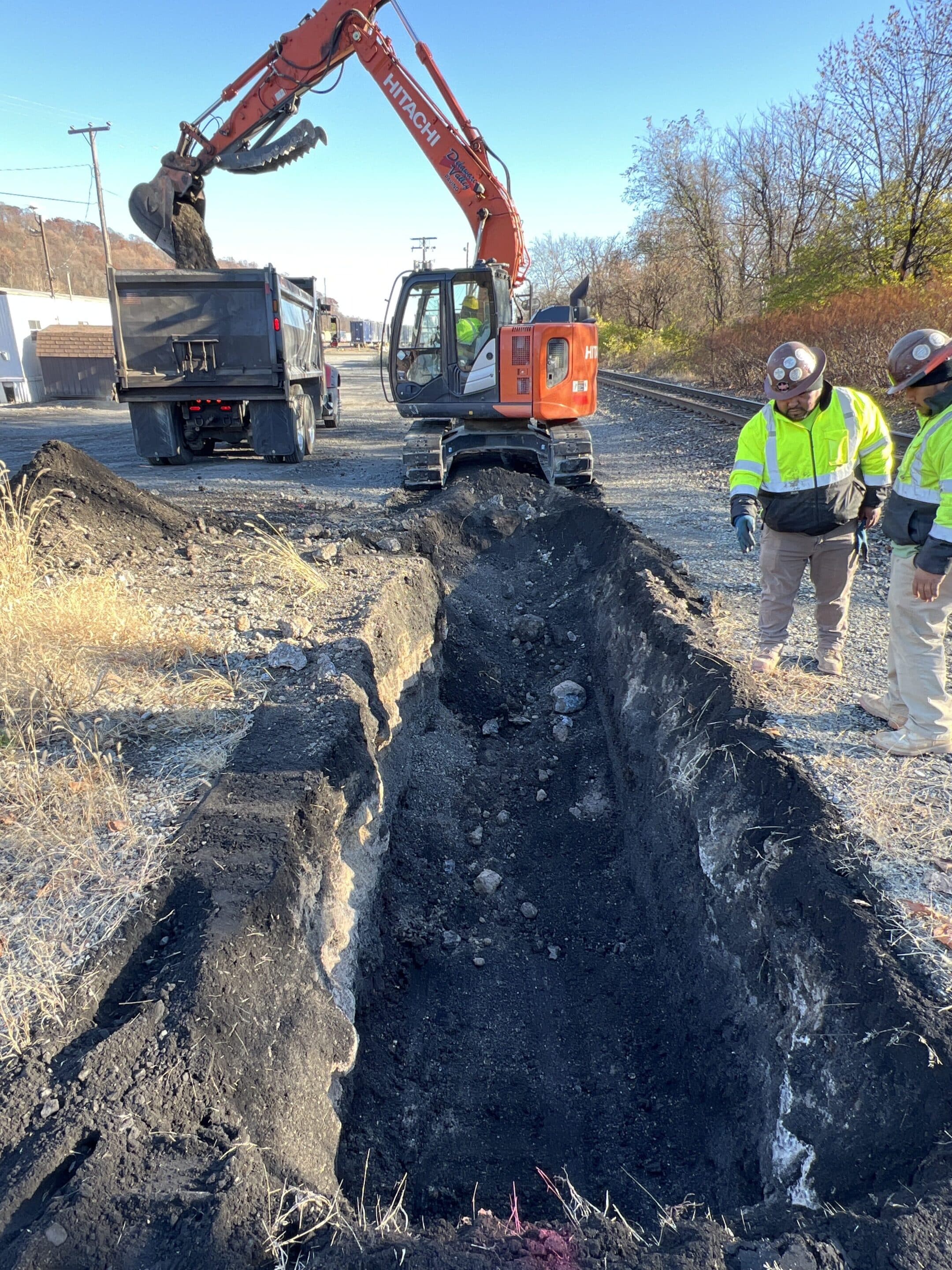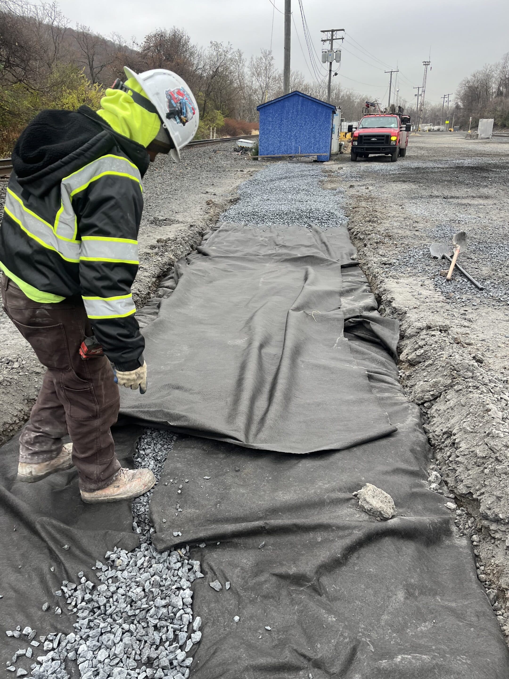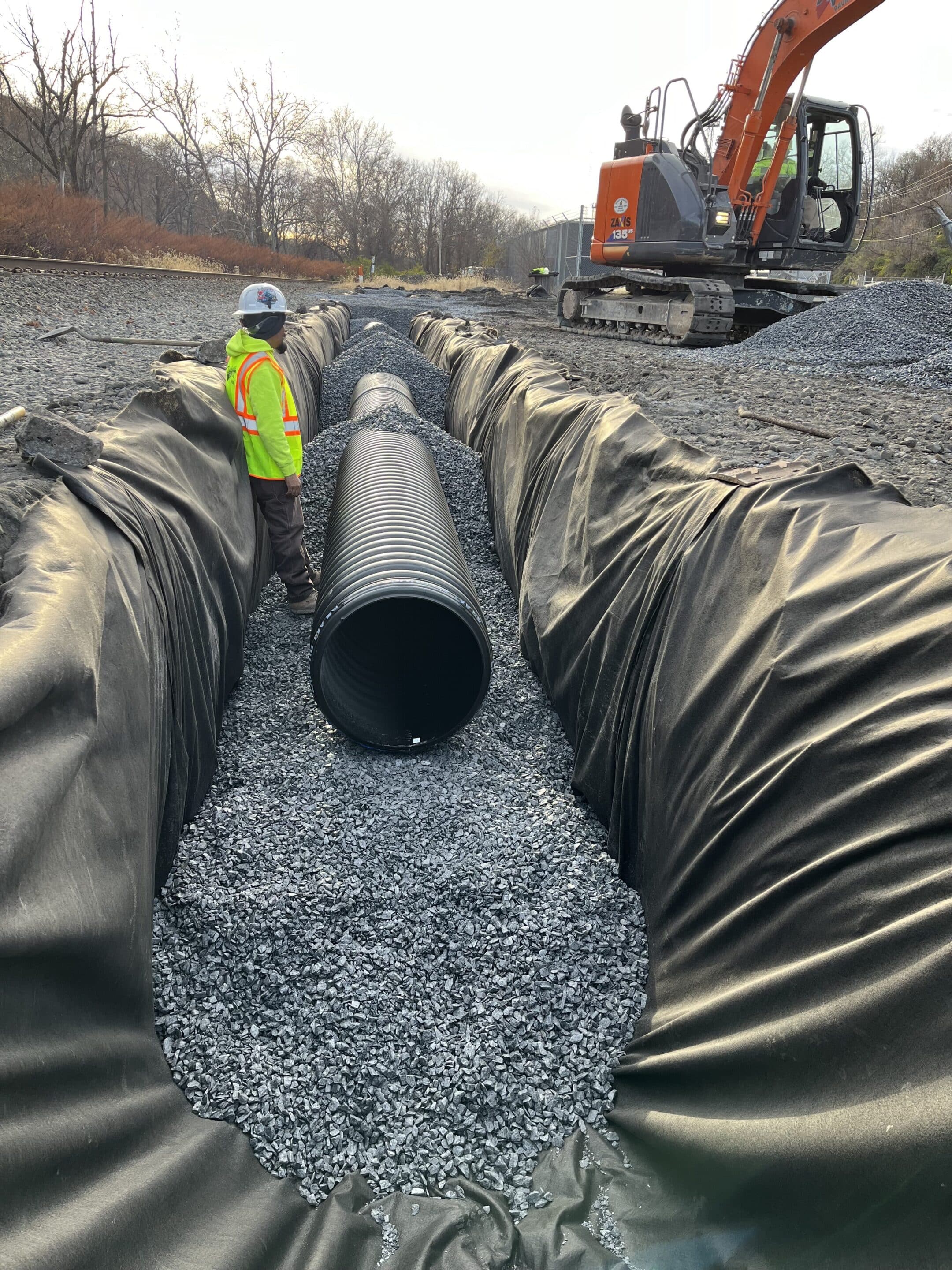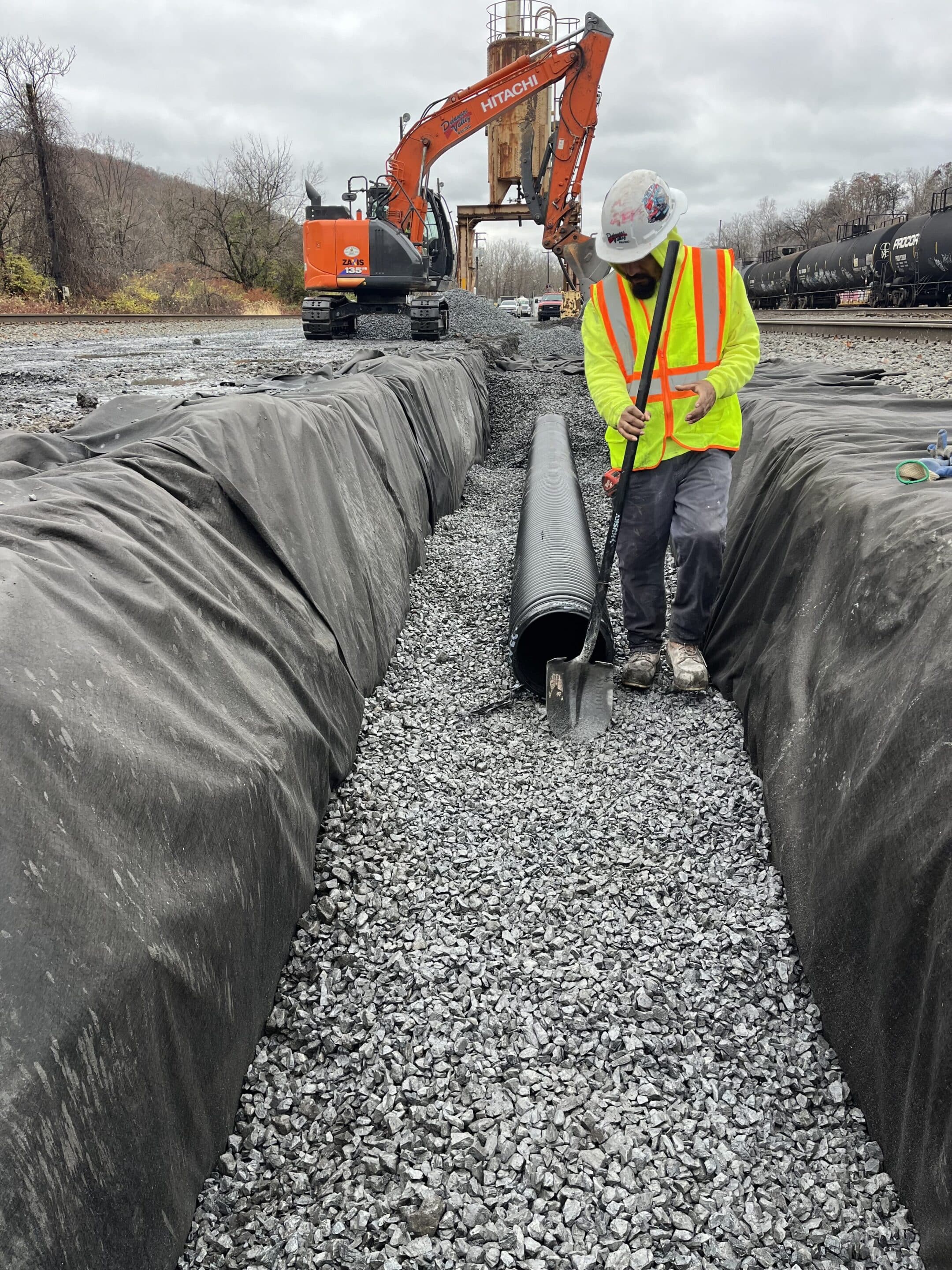 The Delaware Valley Paving Crew installing new perforated pipe to solve drainage issues at a large train depot.